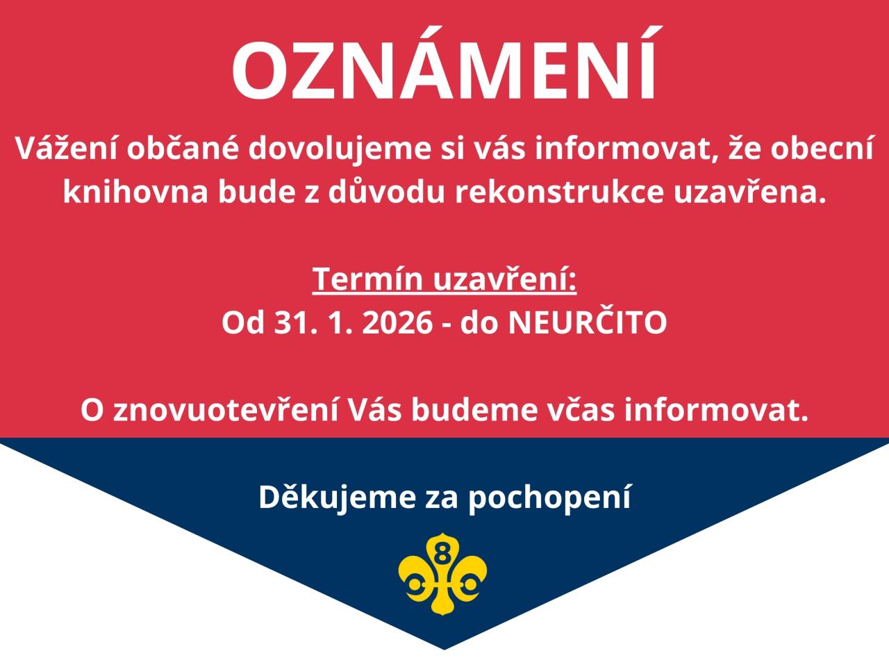 obecní knihovna bude z důvodu rekonstrukce uzavřena od 31. 1. 2026 do odvolání.